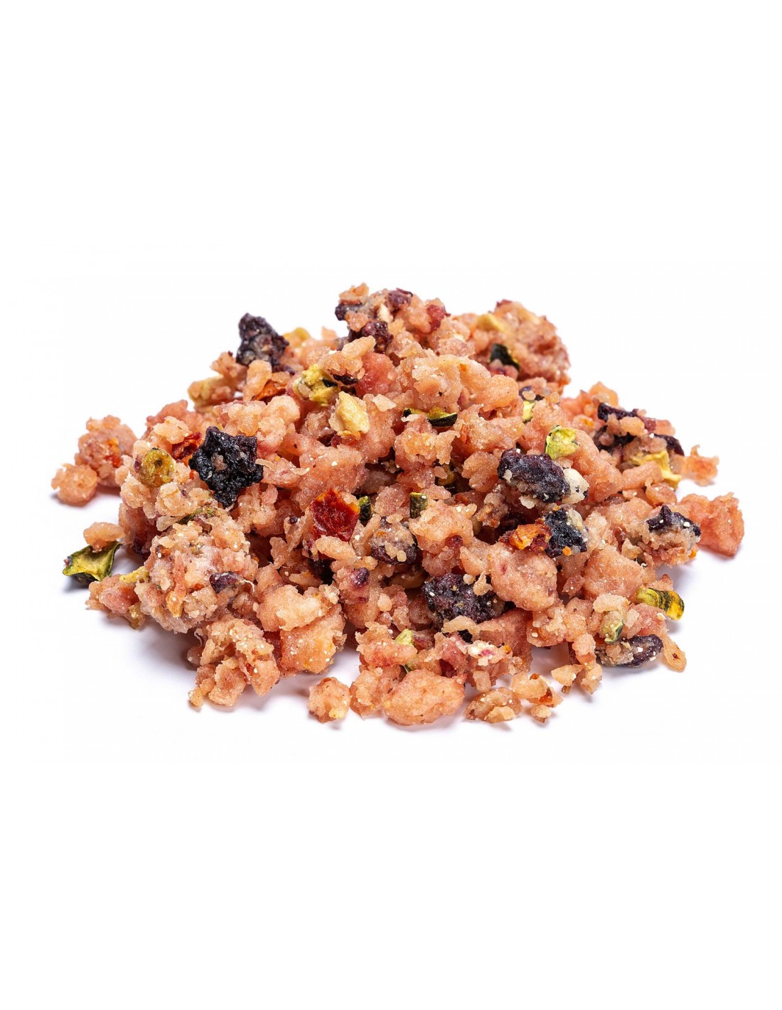 Dehydrated turkey breast and thigh 73.5%, dehydrated vegetables and fruit 11.5% (carrot, pumpkin, zucchini, apple and cranberry), turkey fat 7%, turkey heart 3%, eggshell 3%, cod liver oil, ascophyllum nodosum algae, natural probiotic: Bacillus velezensis (DSM 15544) 1x10-9 CFU/g, green-lipped mussel extract, egg membrane and rosemary extract.