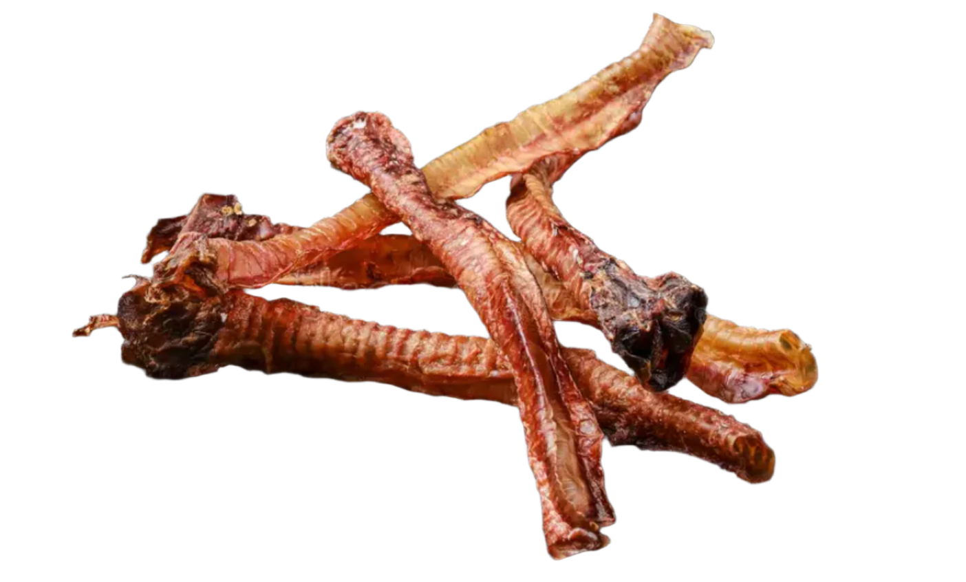 Pork tracheas are a natural snack rich in collagen, ideal for dogs of all sizes. They don't contain bones, but they provide glucosamine and chondroitin naturally, acting as chondroprotectors when consumed regularly.