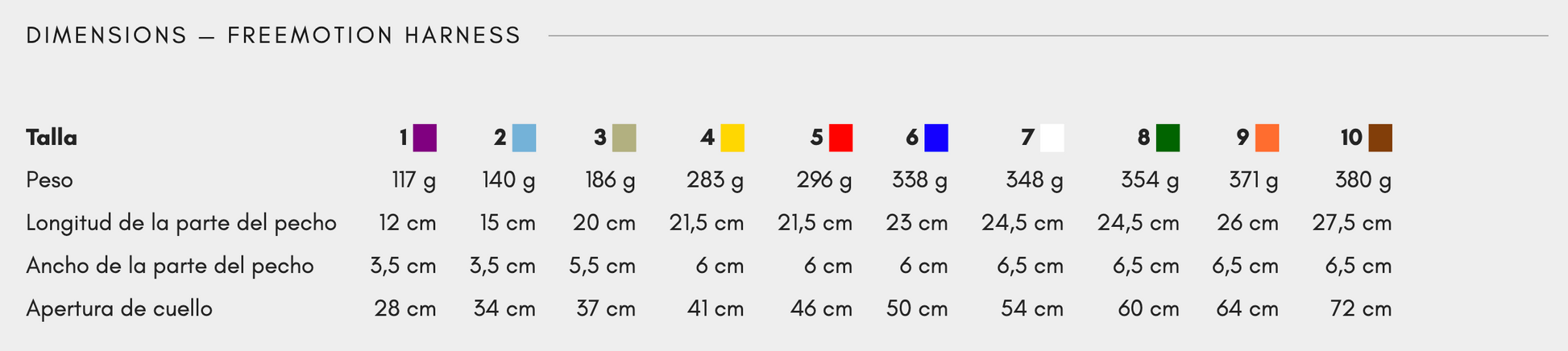 - Color: negro con un parche de color que indica de qué tamaño es el arnés