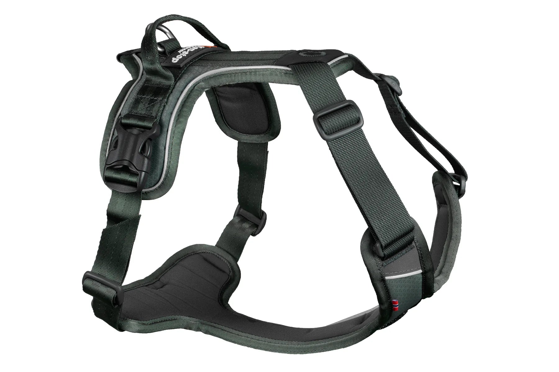 Arnés para perros con correas ajustables alrededor del cuello y el pecho. Asa y tres puntos de enganche para la correa hacen que este arnés sea muy versátil.