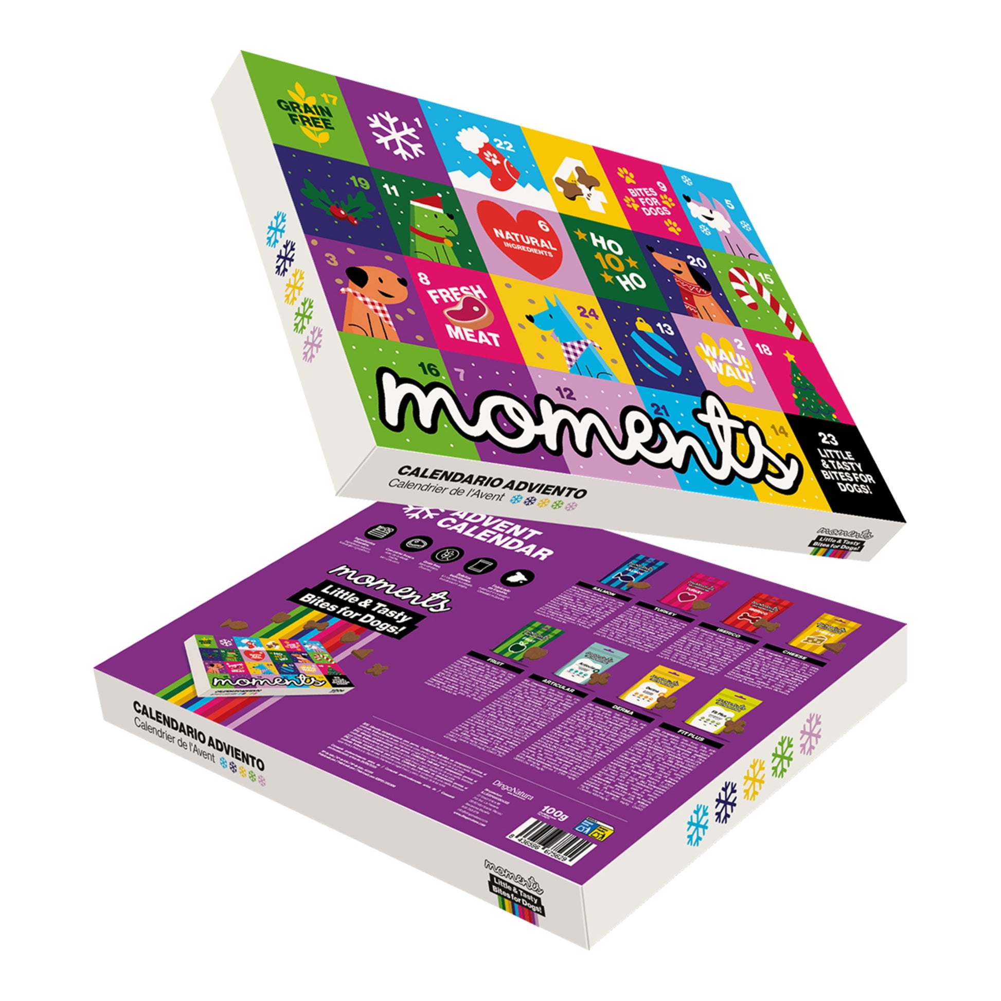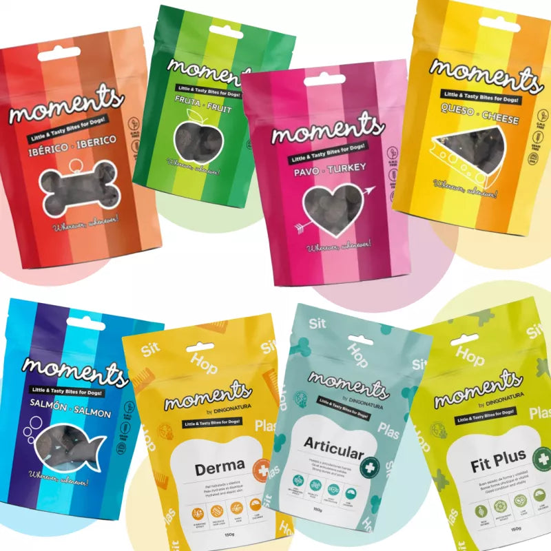 Composición: - Moments Snack Salmón para Perros: Salmón fresco (70%), patata, zanahoria, brócoli, puerro, aceite de salmón (rico en DHA). - Moments Snack Pavo para Perros: Pavo fresco (70%), patata, arándanos, frambuesa, remolacha roja, aceite de salmón (rico en DHA). - Moments Snack Ibérico para Perros: Cerdo ibérico fresco (70%), patata, zanahoria, brócoli, puerro, aceite de salmón (rico en DHA). - Moments Snack Queso para Perros: Pollo fresco (70%), patata, queso, miel, aceite de salmón (rico en DHA). - Moments Snack Fruta para Perros: Pollo fresco (70%), patata, manzana, pera, aceite de salmón (rico en DHA). - Moments Snack Articular para Perros: Pollo fresco 50%, pollo deshidratado, patata deshidratada, pulpa de manzana, salmón fresco (4%), glicerina vegetal, aceite de salmón. - Moments Snack Derma para Perros: Pollo fresco 50%, pollo deshidratado, patata deshidratada, pulpa de manzana, salmón fresco (4%), glicerina vegetal, aceite de salmón. -Moments Snack Fit Plus para Perros: Pollo fresco 50%, pollo deshidratado, patata deshidratada, pulpa de manzana, pavo fresco (4%), glicerina vegetal, aceite de salmón.