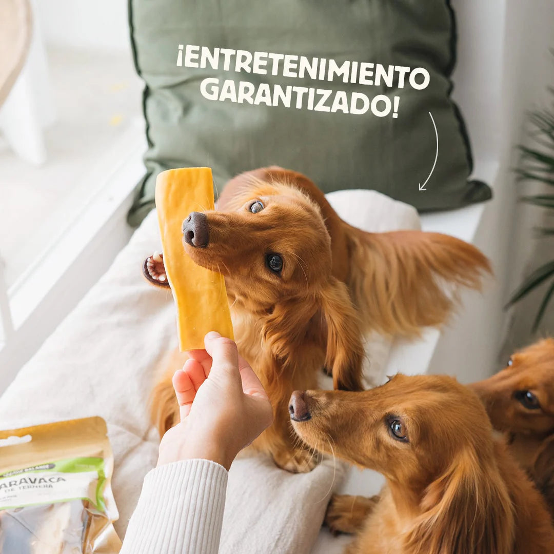 La piel de vaca en esta versión es de dureza alta, apta para las mandíbulas más fuertes de cualquier tamaño. Para los más pequeños o cachorros será un entretenimiento de larga duración.