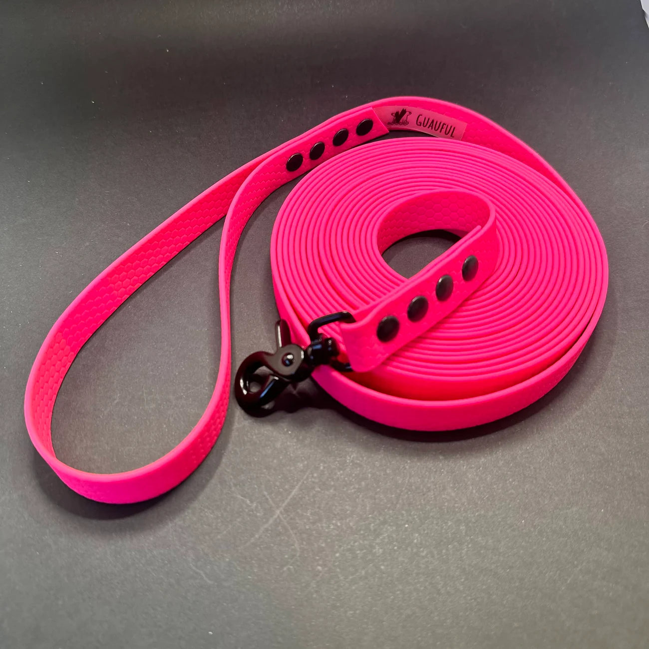 Correa con patrón de panal (hexagonal) o liso en ambos lados y recubierta de PVC. Totalmente personalizable y a medida con un mosquetón.
