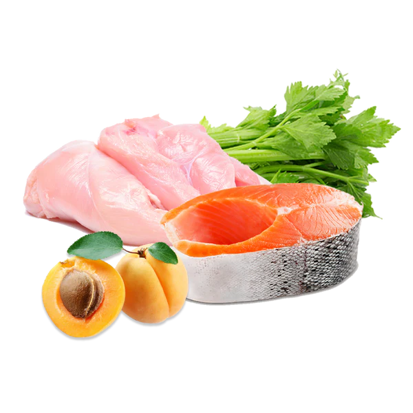 80% pavo y salmón, con apio y albaricoques