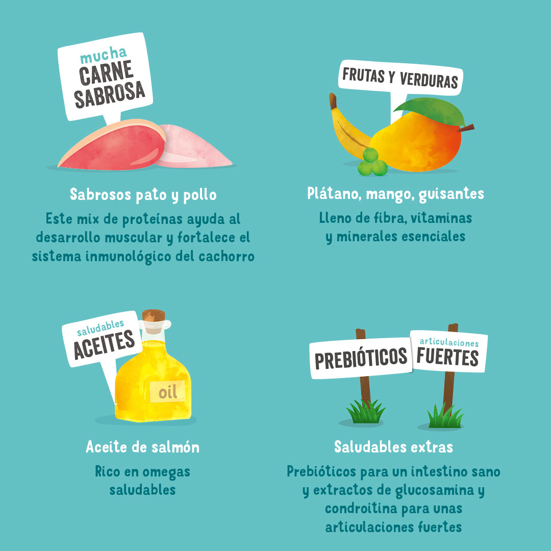 Repleta de sabroso pato y pollo, esta receta sin cereales está especialmente diseñada para satisfacer las necesidades nutricionales de un cachorro en crecimiento. Está repleta de suculentas proteínas, que ayudan a la formación de los músculos y favorecen el buen funcionamiento del organismo. La receta contiene prebióticos para un intestino sano y añadimos extractos de glucosamina y condroitina para fortalecer las articulaciones. Además, añadimos a la carne algunos complementos nutritivos (como el corazón y el hígado) para obtener una dosis extra de nutrición. Combinamos nuestras recetas con una mezcla súper saludable de frutas y verduras, además de un refuerzo extra de hierbas y productos botánicos nutritivos. A continuación, lo cocinamos al vapor para conservar todo el sabor y sus propiedades.