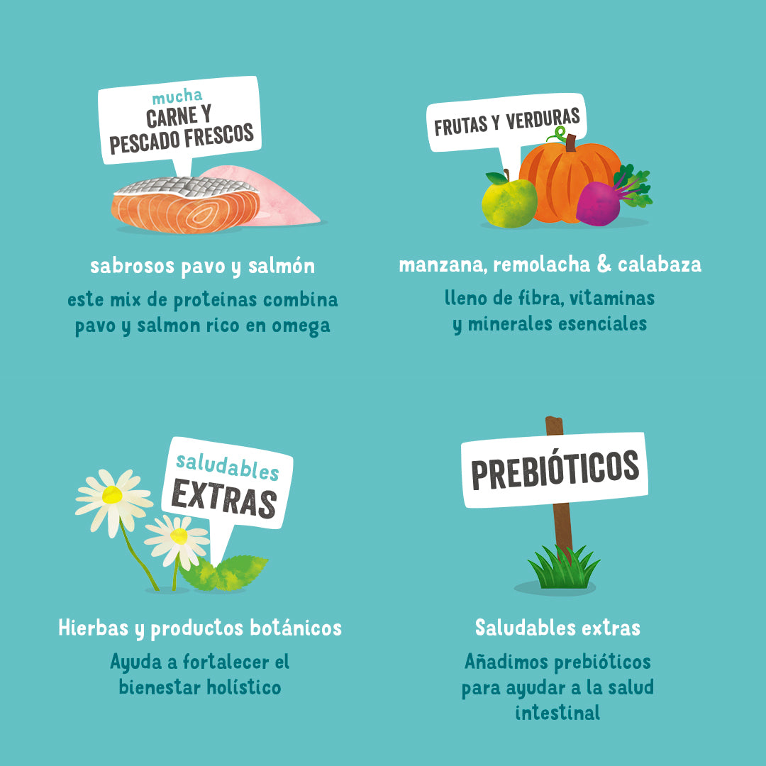 Repleta de sabroso salmón y pavo, esta receta sin cereales es una gran fuente de proteínas. El salmón es una proteína equilibrada y digestiva, repleta de Omega 3 y grasas saludables. Mientras que el pavo proporciona una proteína suculenta y magra. Esta receta también contiene prebióticos para favorecer un intestino sano. Además, añadimos al pescado y la carne algunos complementos (como el corazón y el hígado) para obtener una ración extra de nutrición. Combinamos nuestras recetas con una mezcla súper saludable de frutas y verduras, además de un refuerzo extra de hierbas y productos botánicos. A continuación, las cocinamos al vapor para que conserven todo su sabor y sus propiedades.