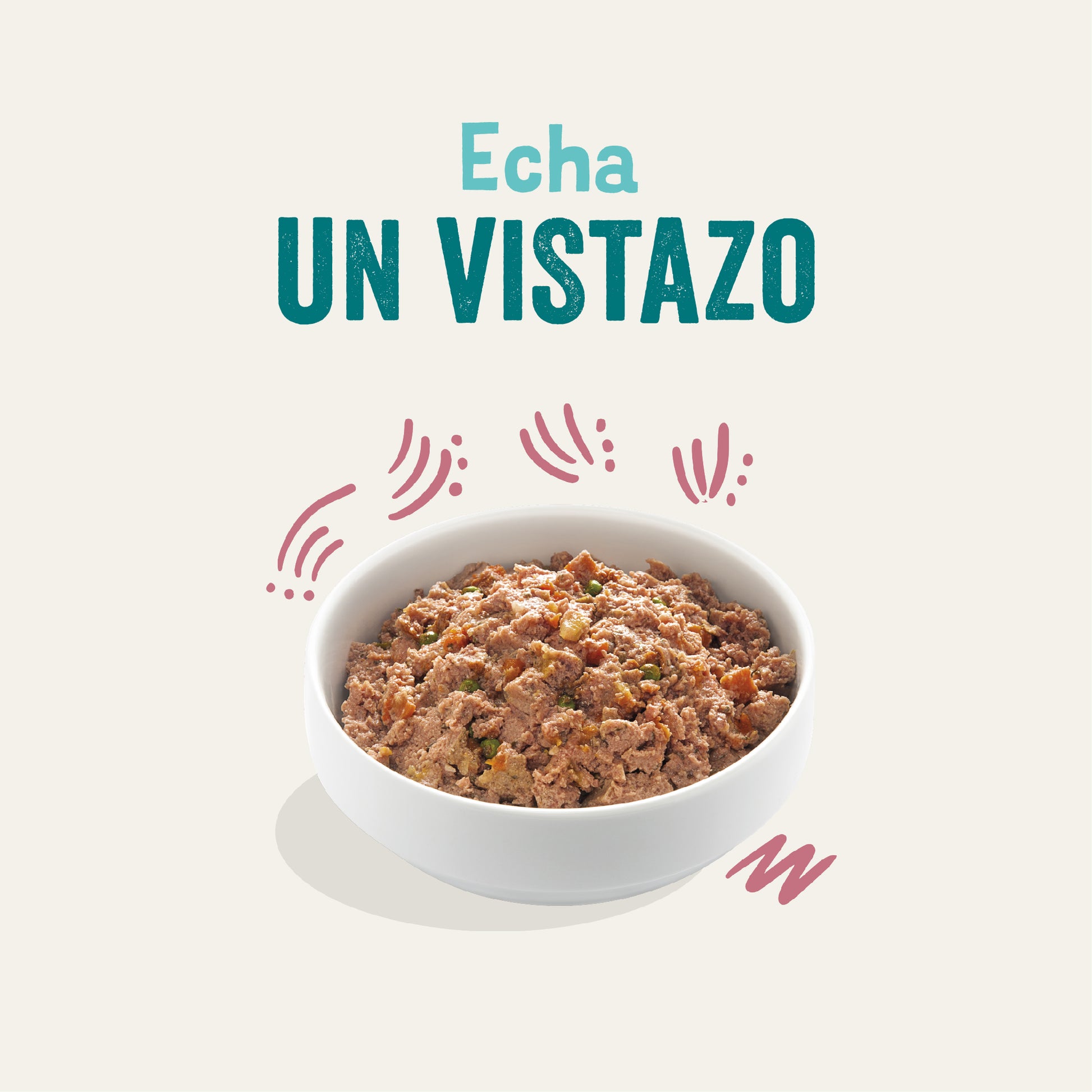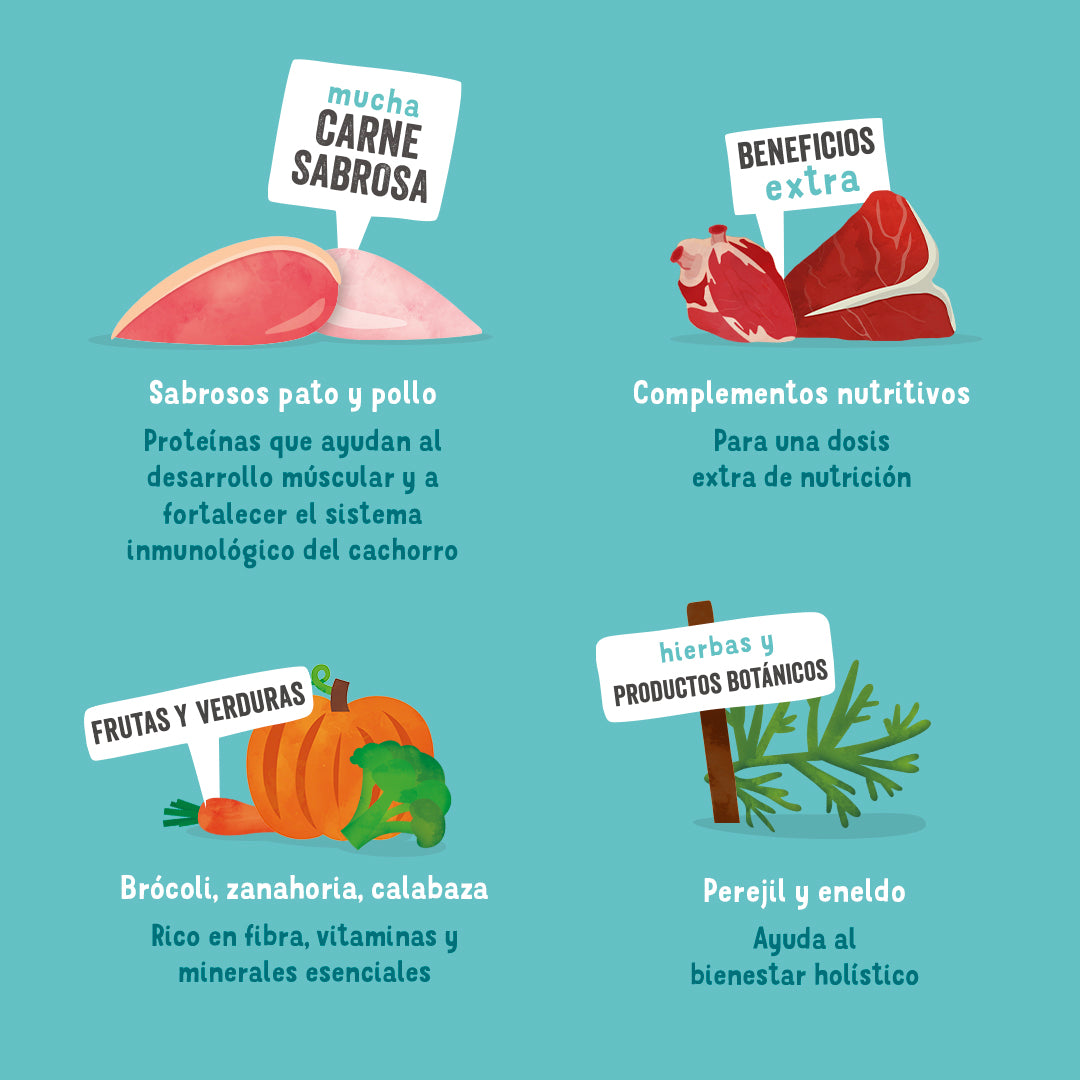 Ingredientes: pato 30%, pollo 26%, minerales, zanahorias 2%, brécol 1%, manzana 1%, calabaza 1%, guisantes 1%, aceite de salmón 0,5%, perejil 0,1%, eneldo 0,1%