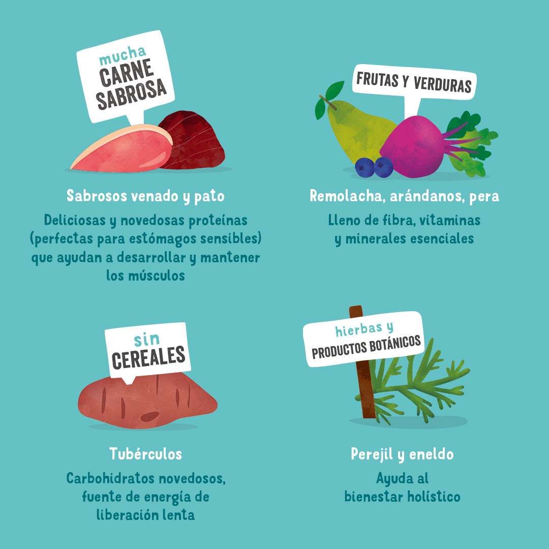 Esta receta de carne sin cereales está elaborada con carne de caza y pato, dos nuevas y excelentes fuentes de proteínas que son especialmente buenas para los perros con estómagos sensibles. La caza está repleta de Omega-3, y la receta también contiene prebióticos para favorecer un intestino sano. Además, combinamos la carne con complementos (como el corazón y el hígado) para obtener una dosis extra de nutrición. Mezclamos nuestras recetas con una combinación súper saludable de frutas y verduras, además de un refuerzo extra de hierbas y productos botánicos. A continuación, las cocinamos al vapor para que conserven todo su sabor y sus propiedades.
