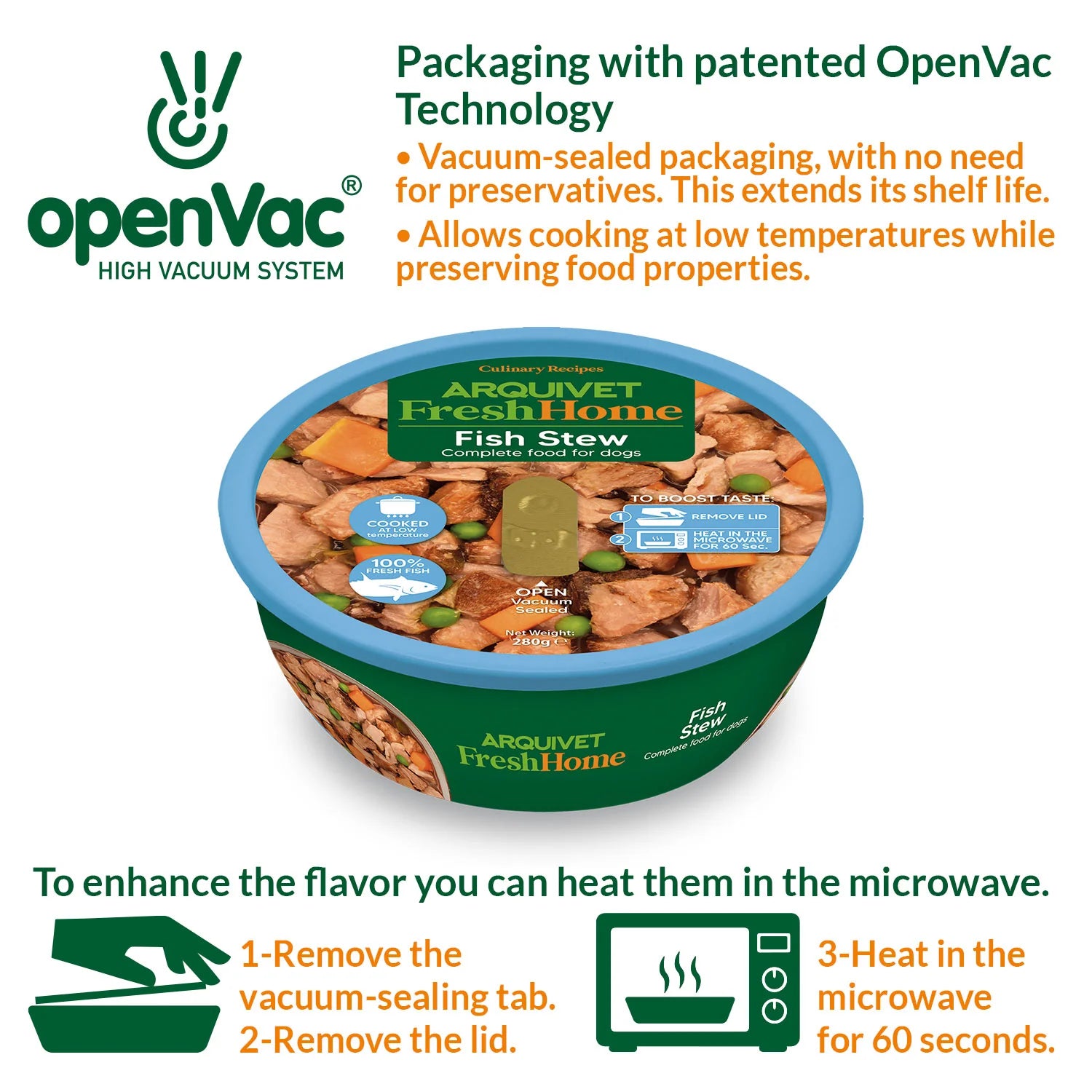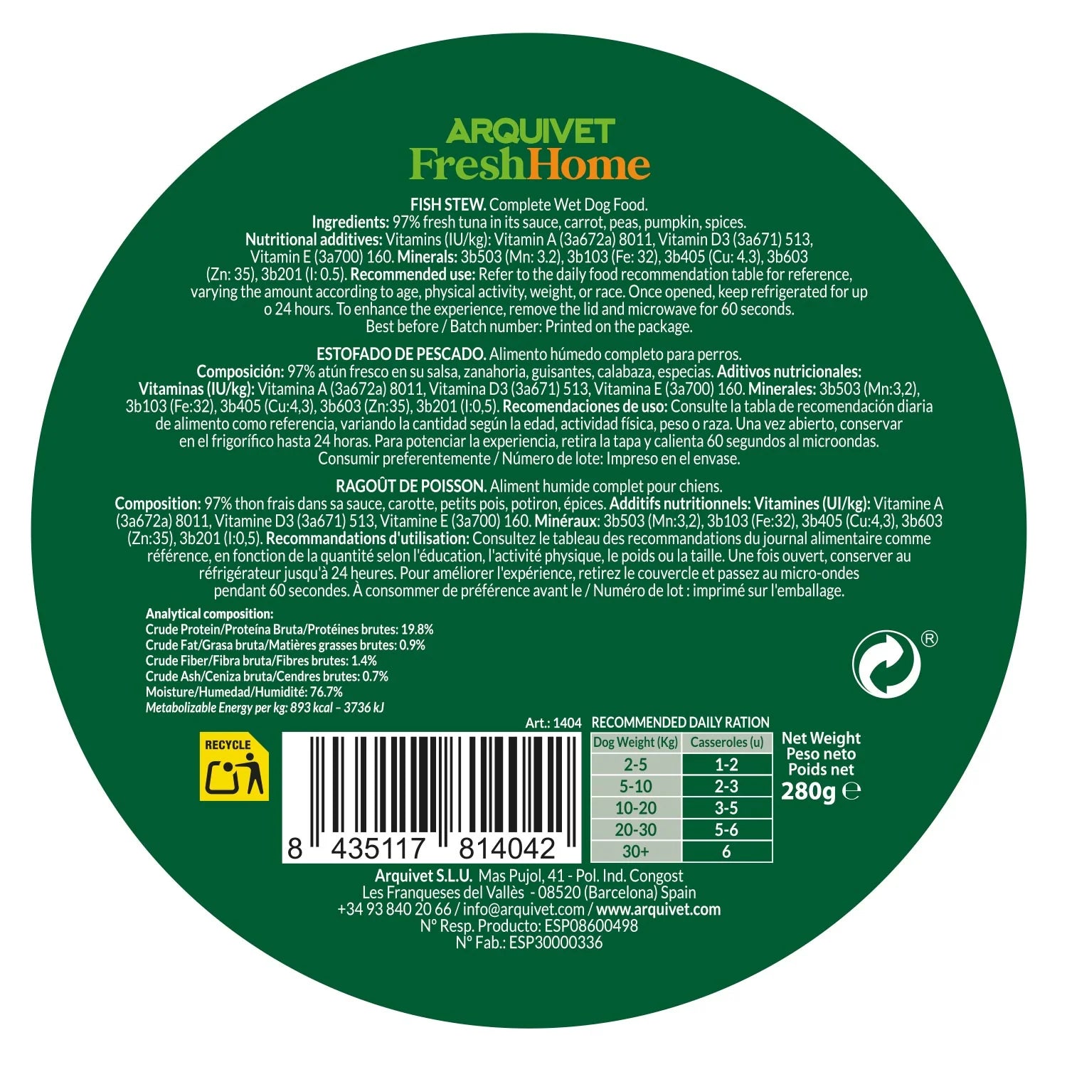 Estofado de pescado. Alimento húmedo completo para perros. Receta casera, cocinada a fuego lento como en casa, 100% natural y equilibrada. Ideal para perros de todas las edades, incluidos aquellos con estómagos sensibles o alergias alimentarias. Puede servirse como única comida o utilizarse como “topping” delicioso aportando un extra de sabor y aroma al alimento seco.